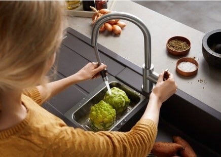 Чаша справа от крана имеет дополнительную рабочую область слева для комфорта использования.
