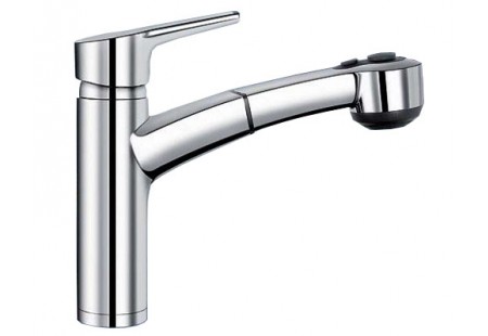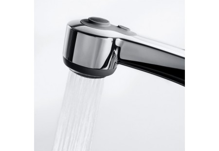 Смесители с выдвижным изливом оснащены специальным шлангом, который способен вытягиваться на значительное расстояние, позволяя использовать его как душ. Шланг может как скрываться в корпусе, так и находиться на виду. В последнем случае его чаще всего поддерживает специальная пружина, придающая ему форму и обеспечивающая устойчивость.