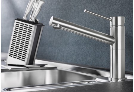 Поворотный излив позволяет поворачивать кран в удобную для пользователя сторону. Обычно угол поворота варьируется от 230 до 360 градусов. Направляется он в нужную сторону механически, т.е. рукой. Такой кран можно установить на мойку с двумя чашами. Для многих потребителей данный вариант удобнее, но за счёт подвижного механизма ломается он быстрее.
