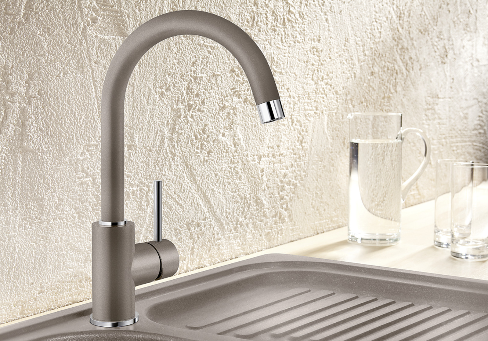 Однорычажный смеситель из Silgranit: плавный ход, разворот на 360°, удобная гибкая подводка.