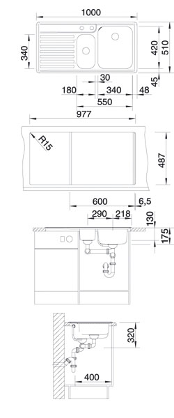 Схема встраивания для мойки Blanco Vektris 6 S нержавеющая сталь полированная чаша справа 513016