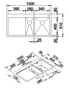 Схема встраивания для мойки Blanco Zerox 6S-IF/A нержавеющая сталь полированная чаша слева клапан-автомат InFino 521644
